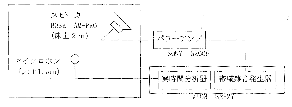 室内に定常ピンクノイズを放射し、各受音点ごとに1/1オクターブバンド毎の音圧レベルを測定する。